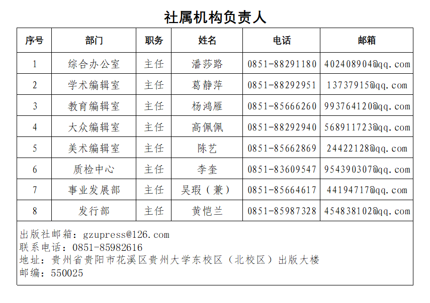 地址:贵州省贵阳市花溪区贵州大学东校区(北校区) 邮编:550025 电话:0851-85982616/88291180 邮箱:gzupress@126.com 备案序号:黔ICP证201008207800号