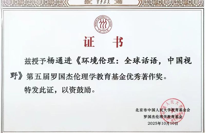 2025年10月12日,由中国人民大学伦理学与道德建设研究中心主办的第五届国杰论坛暨第五届罗国杰伦理学教育基金颁奖典礼在北京举行。贵州大学出版社出版、我校哲学系知名校友杨通进教授所著的《环境伦理:全球话语,中国视野》荣获优秀著作奖。《环境伦理:全球话语,中国视野》系统梳理环境伦理学主要流派,创新提出整合东西方智慧的“四种境界”说,并深入挖掘中国传统文化中的生态智慧,致力于构建一种既能与全球环境话语对话,又具有鲜明中国气派的环境伦理学体系。该书的出版打破了环境伦理学领域长期由西方话语主导的格局,为全球环境危机提供理论方案与中国视野,同时也为我国生态文明建设的实践提供了深厚的理论支撑与道德资源,对推动生态文明的学术创新与实践发展具有重要价值。这一权威奖项是对杨通进教授个人学术成就的高度认可。该书入选“百年贵大学术精品文库”,于2022年由贵州大学出版社出版。据悉,共有五本著作获得本届优秀著作奖:《儒学美德论》(作者:陈来)、《当代西方道义论与功利主义研究》(作者:龚群)、《道德权利研究》(作者:余涌)、《美德政治学的历史类型与现实型构》(作者:詹世友)、《环境伦理:全球话语,中国视野》(作